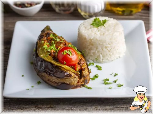 Patlıcanların kabuklarını bir soyup bir bırakarak soyun. Patlıcanları, soyulmuş kısımlarından çok derin olmadan yarın. Bunları tuzlu suda yarım saat dinlendirip suyunu süzün. Kızgın yağda her tarafını eşit pembelikte kızartıp yağını süzün. Diğer taraftan kıymayı soğanla iyice kavurun. Domatesleri küp küp doğrayıp kıyılmış maydanoz tuz ve karabiberi ilâve edin. Suyunu çekene kadar kısık ateşte pişirin. Kızarttığınız patlıcanları fırın tepsisine yarık kısımları yukarı gelecek şekilde dizin. Hazırladığınız kıymalı harcı patlıcanların yarık kısımlarına eşit biçimde doldurun. 1 su bardağı sıcak su ilâvesiyle orta hararetteki fırında suyunu çekene kadar 40-45 dakika pişirin.