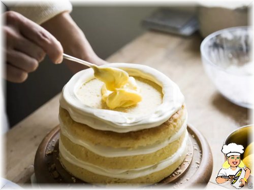 Çıkardıktan sonra bir bıçak yardımıyla pastanın kenarlarını kalıptan ayırın. Limon kabuğu rendesini krem şanti ile karıştırın. Servis tabağmdaki pastanın kenarlarını limon kabuklu krem şanti ile kaplayın.