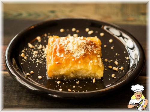 Soğuyan muhallebiyi karıştırıp kalıpta pişirdiğiniz yufkaların üzerine yayın. Kalan hamurları aynı şekilde açın, aralarına tereyağı sürerek muhallebinin üzerine üst üste sıralayın. Keskin bir bıçak ile tatlıyı kareler şeklinde dilimleyin ve fırının orta rafında pişirin.