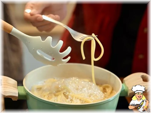 Spaghetti için uzun saplı tahta çatal, diğer çeşitler için uzun saplı tahta kaşık kullanın.