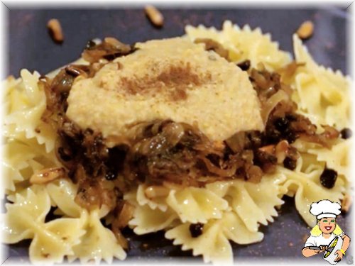 Soğanlarımızı doğruyoruz ve zeytinyağında biraz tuzla soteliyoruz. Bu işlemi on dakika kadar sürdürerek soğanlarımızın iyice karamelize olmasını sağlıyoruz. Başka bir tavada dolmalık fıstıklarımızı yağsız bir şekilde soteliyoruz. Pişmelerini durdurmak için başka bir kaba alıyoruz. Ardından kuş üzümlerini ve dolmalık fıstıkları karamelize soğanımıza ekliyoruz. Kabuklarından ayırdığımız nohutları blender’a alıp iki kaşık tahin ve yarım limon suyuyla, üzerine tuz, karabiber, kimyon ve tarçın da ekleyerek püre haline getiriyoruz. Kıvamını ayarlamak için biraz su kullanabiliriz. Daha sonra humusumuzu ısıtırken makarnanın haşlama suyundan da yararlanarak doğru kıvama getiriyoruz. Yemeğimiz hazır.