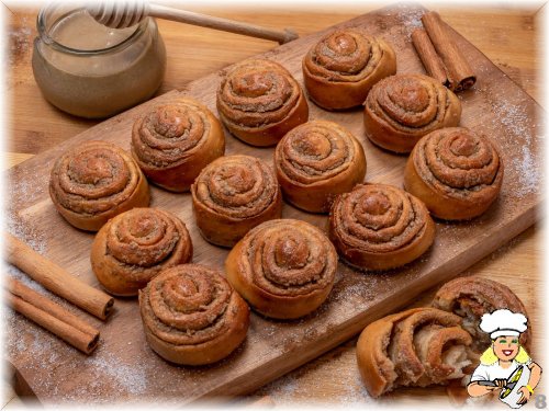 Tahine şeker katıp karıştırınız. Mayalanan hamuru tekrar yoğurup 5 eşit parçaya ayırınız. Yağlanmış masa üzerinde her yumağı mümkün olduğu kadar açıp büyütünüz. Üzerine 1/5 şeker tahin karışımını döküp yayınız. İki parmak genişliğinde sararak rulo yapınız. Ruloyu bir ucundan başlayıp döndürerek daire oluşturunuz. Üstten hafif bastırarak tepsiye aralıklı yerleştiriniz. Tekrar hacminin iki misli oluncaya kadar mayalandırınız. Orta hararetli fırında pişiriniz.